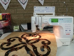 Today I have been using the JANOME 6600P to stitch out some machine applique..I reduced the size of the zig zag stitch to 2.5 and 0.65 to get a lovely small satin stitch for the edge of my applique. It was very handy having the knee lift (which is standard with the machine) to guide my fabric and not remove my hands and also the stitch speed was slow enough to help guide it right along the edge. The 6600P comes standard with large extension table which is great for big blocks. Come in and have a demonstration on the JANOME 6600P